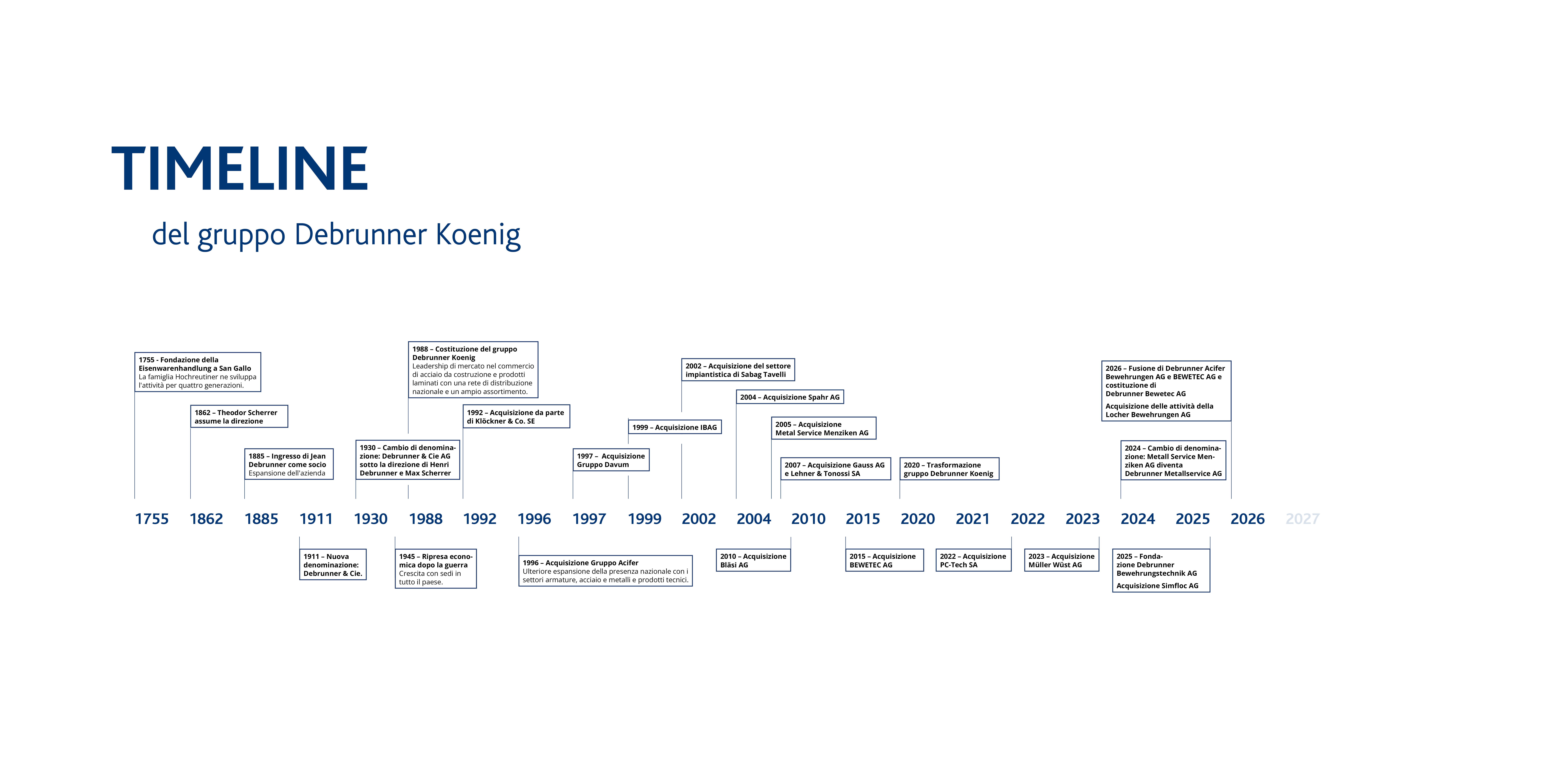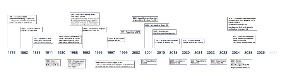 Il Gruppo Debrunner Koenig fu fondato a San Gallo nel 1755 con il nome di Hochreutinersche Eisenwarenhandlung. Jean Debrunner subentrò nel 1885, espanse l'azienda e nel 1911 cambiò la ragione sociale in Debrunner & Cie. Le conseguenze della prima guerra mondiale e lo scoppio della seconda guerra mondiale misero la nuova società per azioni a dura prova.